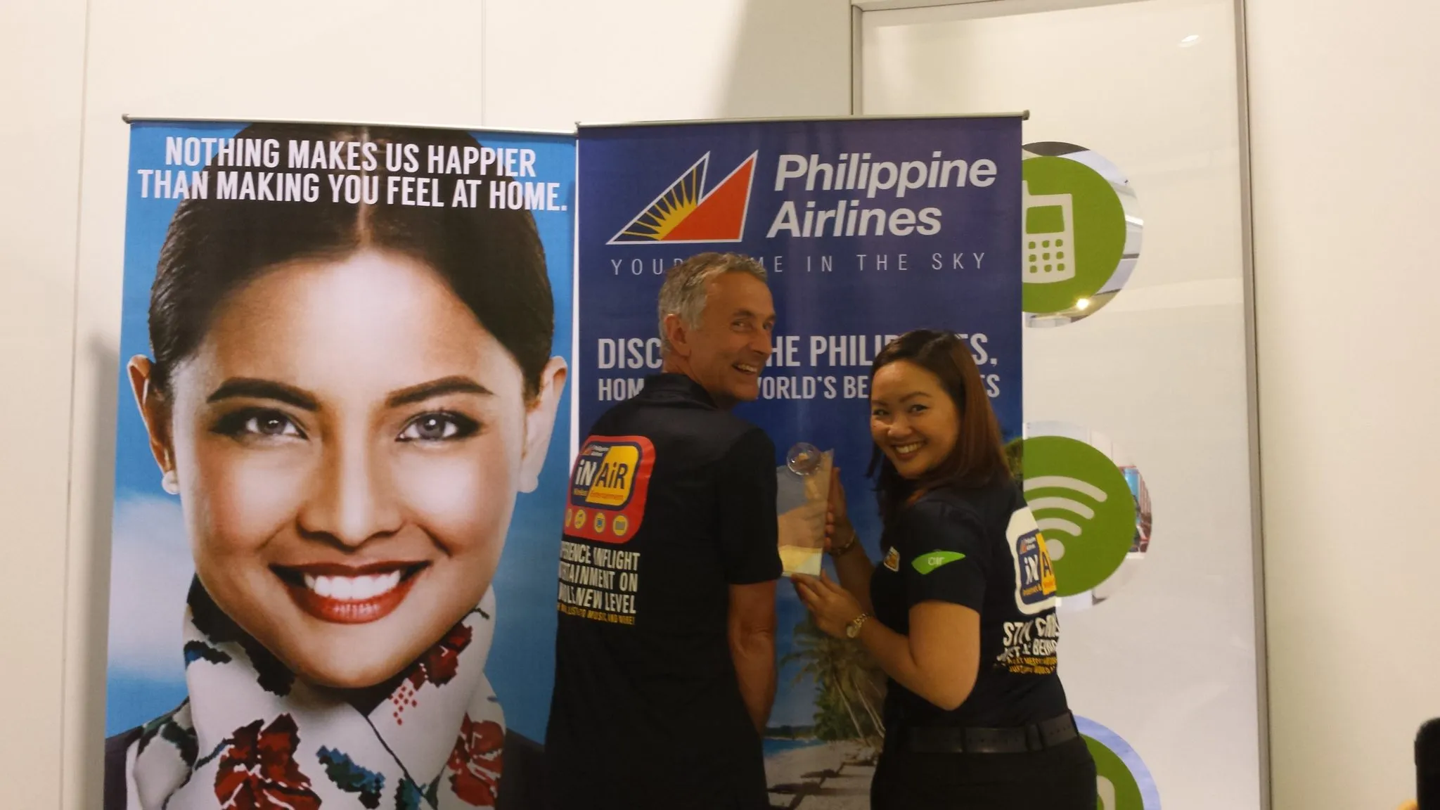 Philippine Airlines and OnAir celebrating the roll-out of a purely wireless cabin on the carrier’s A330s. The inflight entertainment and connectivity offering includes Global Eagle Entertainment’s WISE wireless IFE software.