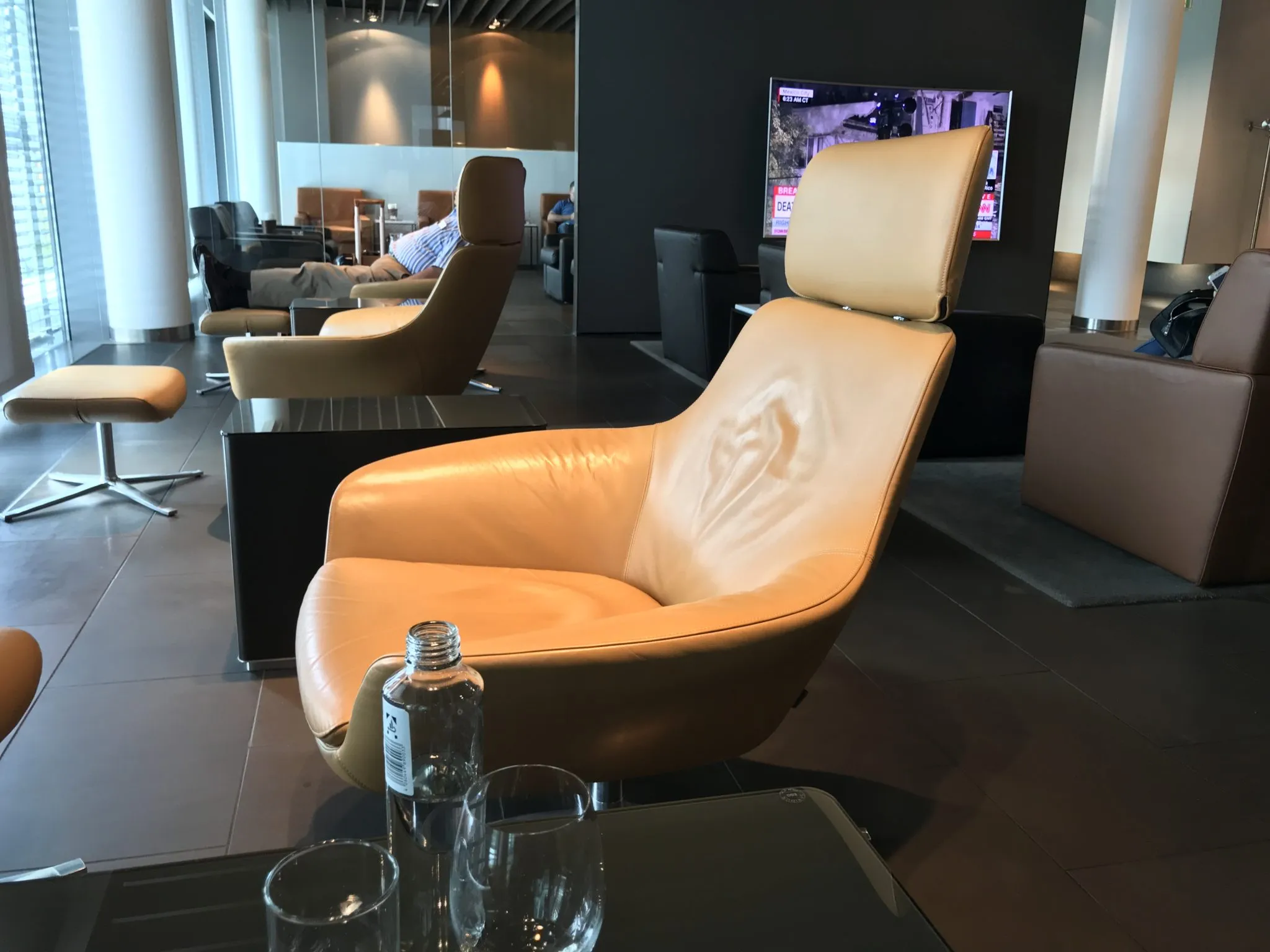 Inside, the lounge gives a sense of understated elegance. It’s browns and greys throughout, and it feels like nowhere else in the world: part top-notch business hotel lobby, part 1980s bar with a wall of whisky, part blue-chip company dining room. The entire experience is a success in making the airport experience not feel like an airport experience.