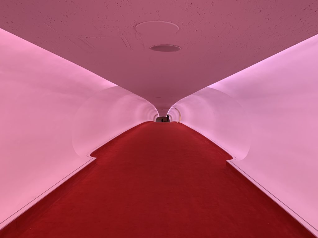 Guest check-in starts at the original space of the TWA check-in counters, now upgraded with speedy self-service kiosks. The space retains the baggage belt for temporary bag storage. Guest rooms are available with several types of views, ranging from “runway” to “historic TWA” view to rooms without much of any view.