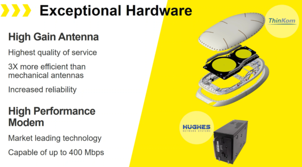 Spirit and Thales eventually switched to ThinKom Solutions’ popular Ka2517 mechanically steered phased-array antenna. Management said the Ka2517 is “three times more efficient than any other antenna”, calling it a “significant game changer”. And it touted “market leader” Hughes’ modem technology, which is also part of the package.