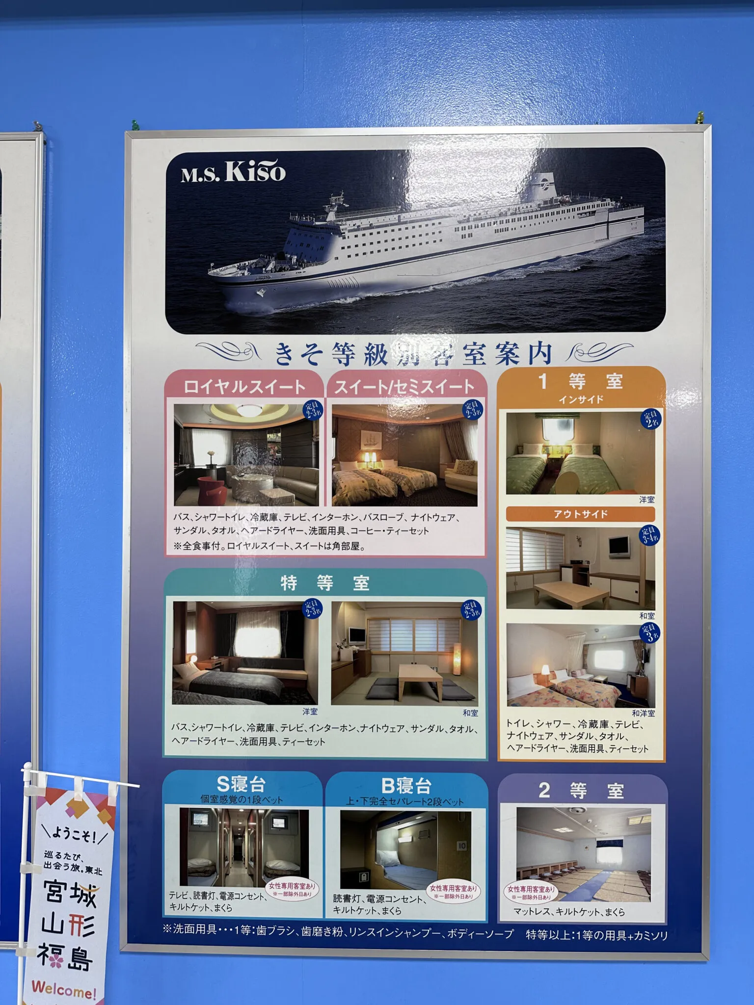 Getting to the port was simple: 20 minutes on a local train from central Sendai and then a quick taxi or bus ride to the port. Checkin was simple, although the presence of English, written or spoken, was minimal. I have some basic tourist Japanese and an immense willingness to use Google Translate, which was sufficient to exchange payment, get tickets and understand which of the meal vouchers was for lunch, dinner and breakfast.